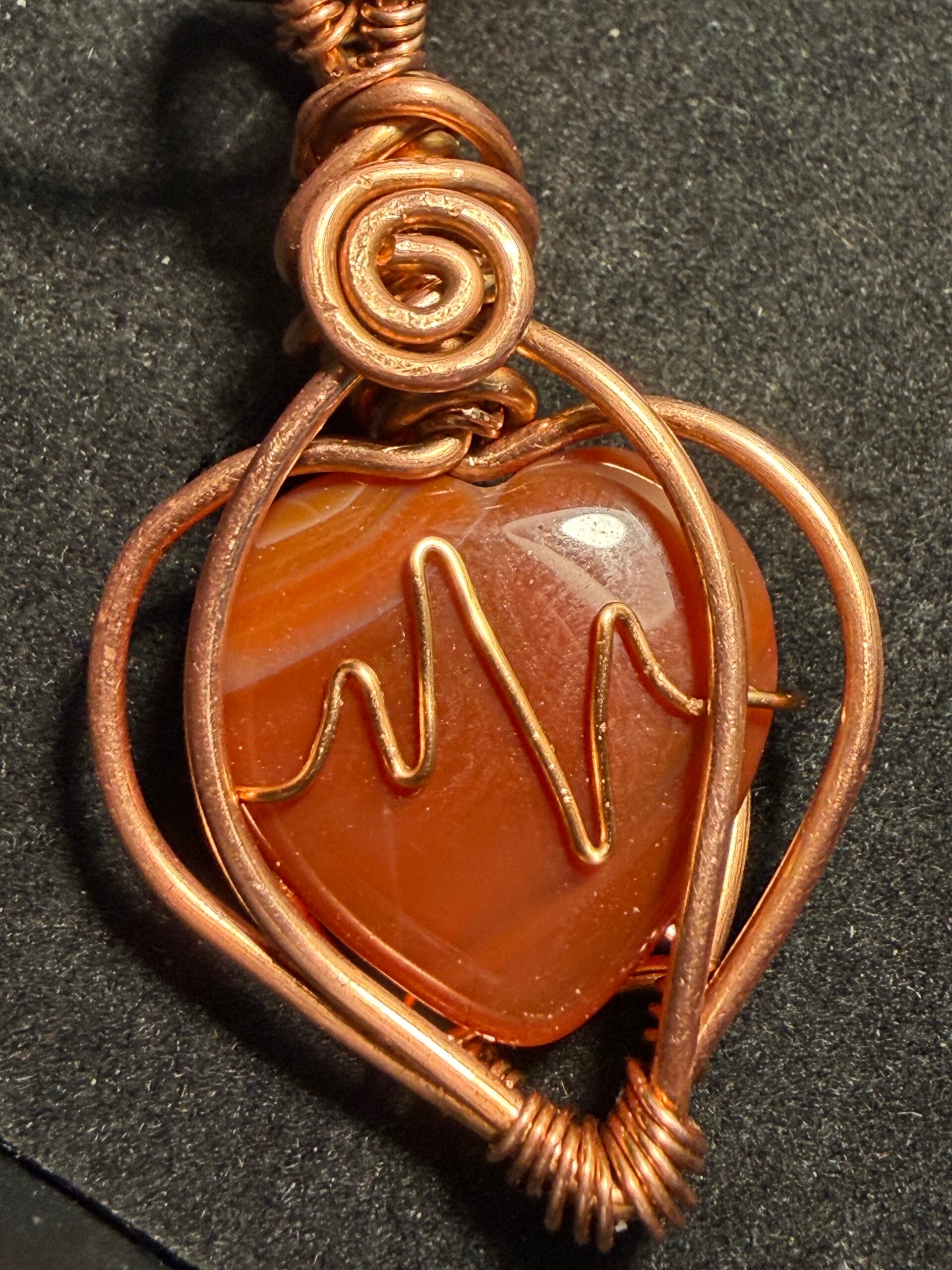 Carnelian crystal heart wrapped with copper. Heart rhythm pendant